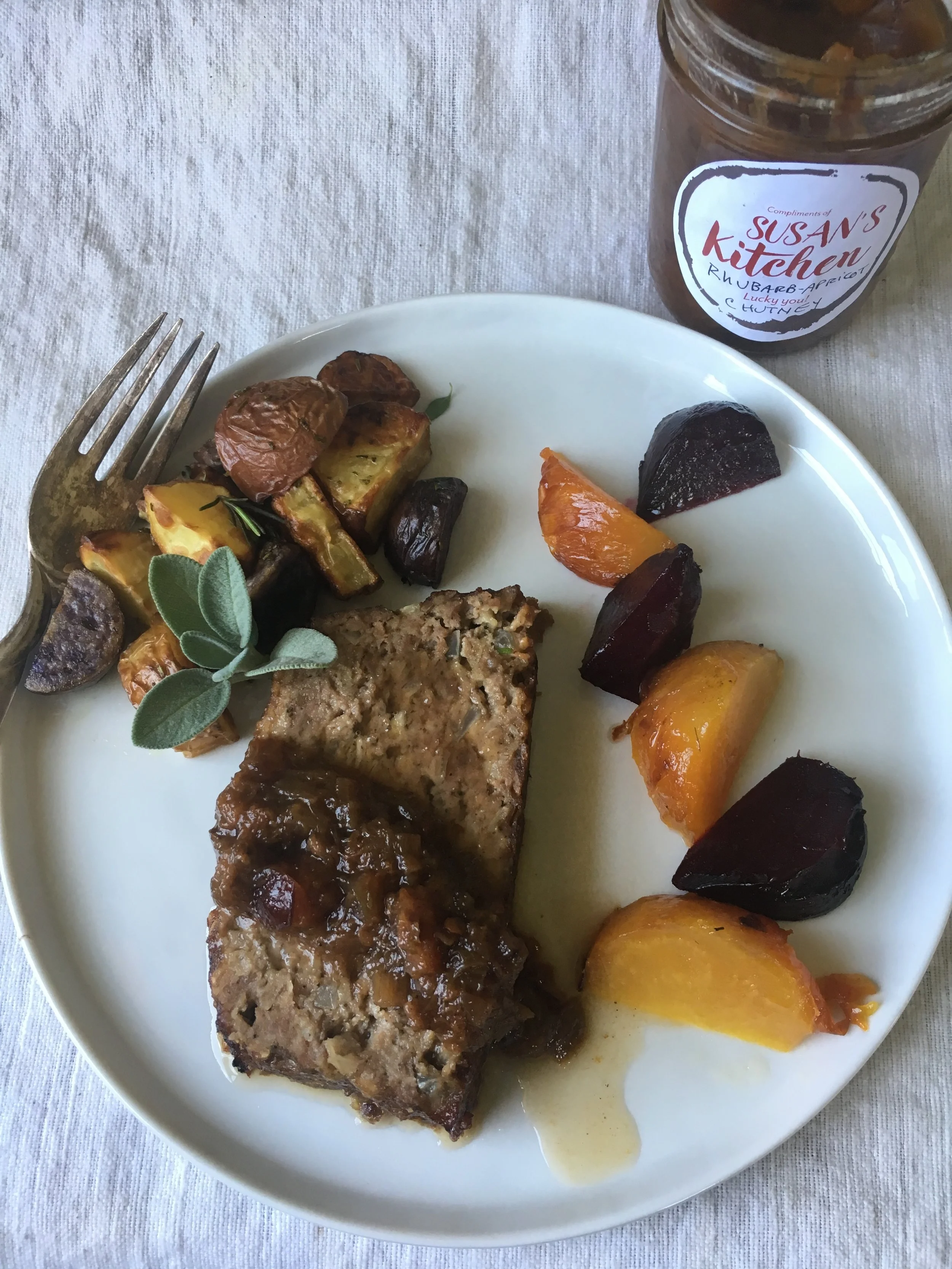 One of the pairings often found on pate mirror displays is a sauce that complements the forcemeat, and not long after discovering a strawberry-rhubarb chutney in the Chicago Tribune’s food section I realized that ketchup wasn’t the best partner for my by now-beloved meatloaf. That chutney has undergone all kinds of riffs, as well. I’ve made it with peaches and rhubarb, cranberry and rhubarb, apricot, mango, and rhubarb, etc. The sour tang of the rhubarb in concert with the onions, cider vinegar and sugar form the backbone of the one condiment I’ve been making, canning, and giving to friends and family for years. It is a suitably memorable partner for mom’s Apple Sage Meatloaf.