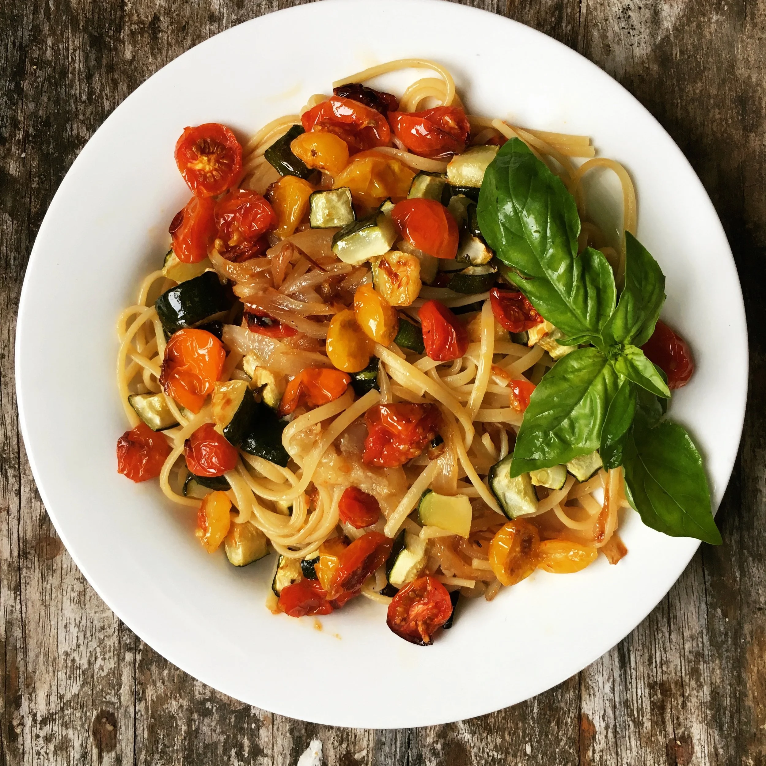 It was a simple combination of ingredients that were all at hand, all transformed and elevated by the application of heat. Roasted tomatoes, garlic, and zucchini, caramelized onions, and linguini, all tossed at the end with fresh herbs, a bit of asiago, and the coupe de grace, the Richhiuti’s olive oil.