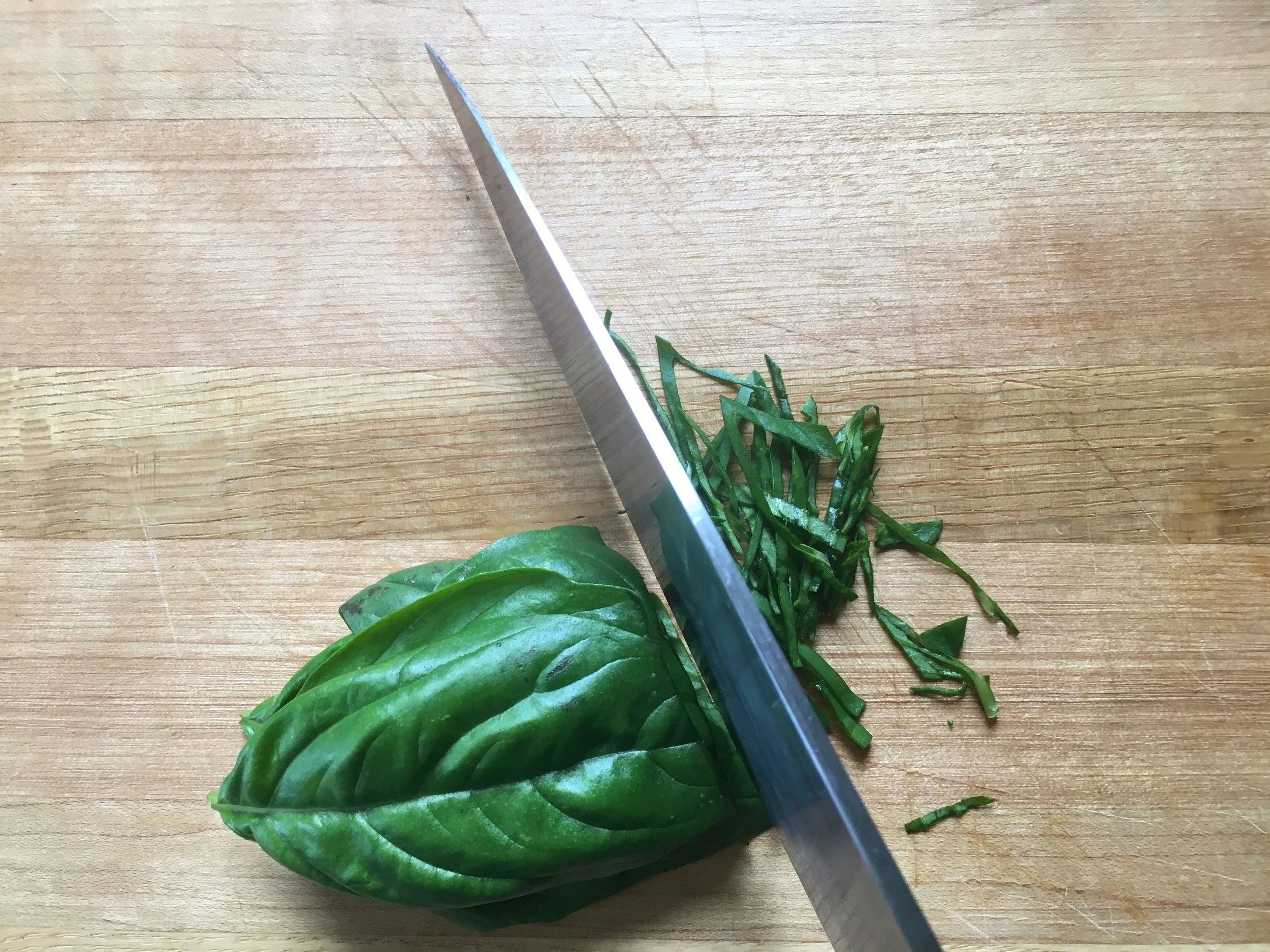 In culinary school there was a lot of hooha about how to make ever-so-thin ribbons of basil leaves. After washing and drying the leaves, we were told to stack 2 or 3 together and roll them up in a tight roll before slicing. Subsequent years and experience have taught me that simply stacking the washed and dried leaves (about 5 at a time, or as many as you can handle without them sliding around), and slicing them is easier and keeps the leaves from turning black longer.